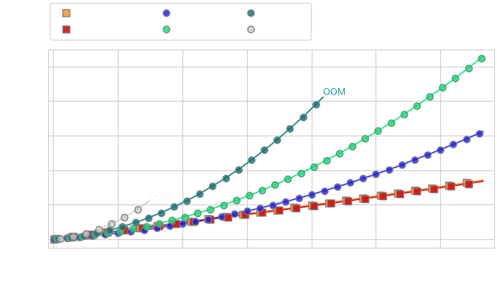 While token compression reduces the cost of token insertion for short conversations, it cannot alone prevent the increased memory usage leading to OOM when the number of tokens is too high (left). In contrast, CASA maintains high inference speed over much longer horizons (right), while always making high-resolution image information available to the model.