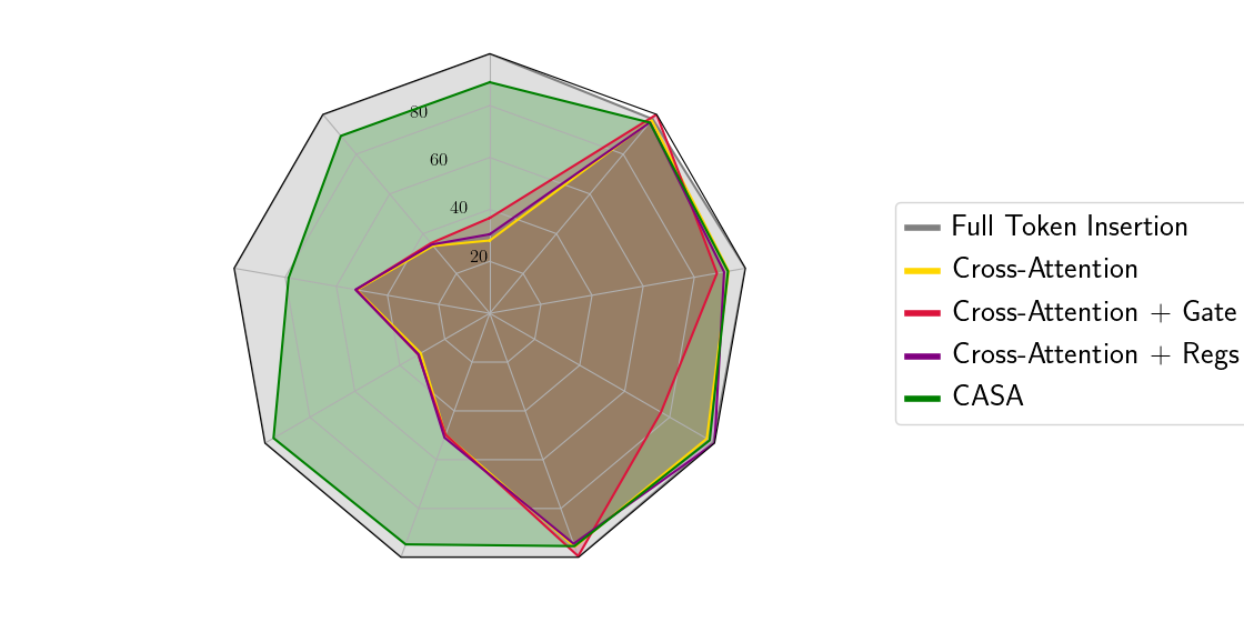 - CASA efficiently injects visual information into LLMs. In particular, CASA achieves performance comparable to token insertion approaches, but with a compute and memory cost that scales similar to cross-attention-based designs as the number of tokens grows.