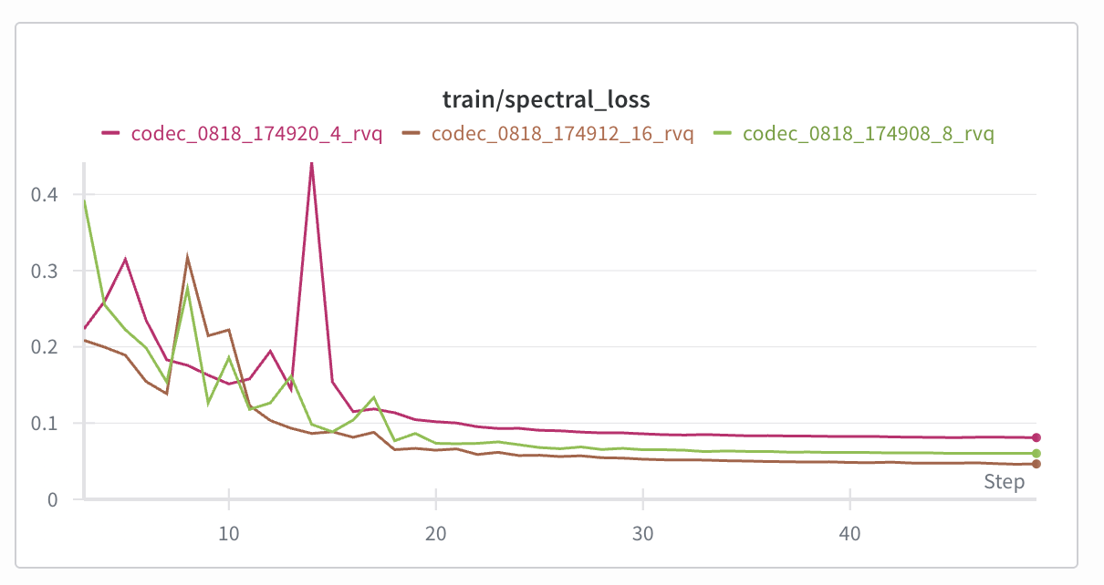 We can sacrifice some acoustic quality to improve the semantics by reducing the number of RVQ levels. Let’s do 8. That way, we get higher audio compression, and a proportionally higher part of the loss comes from the semantic token, since now it’s 1/8 tokens and not just 1/32.